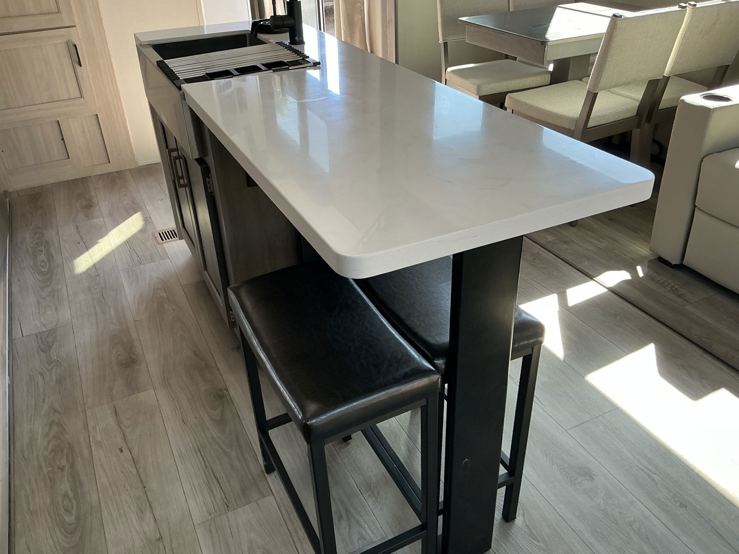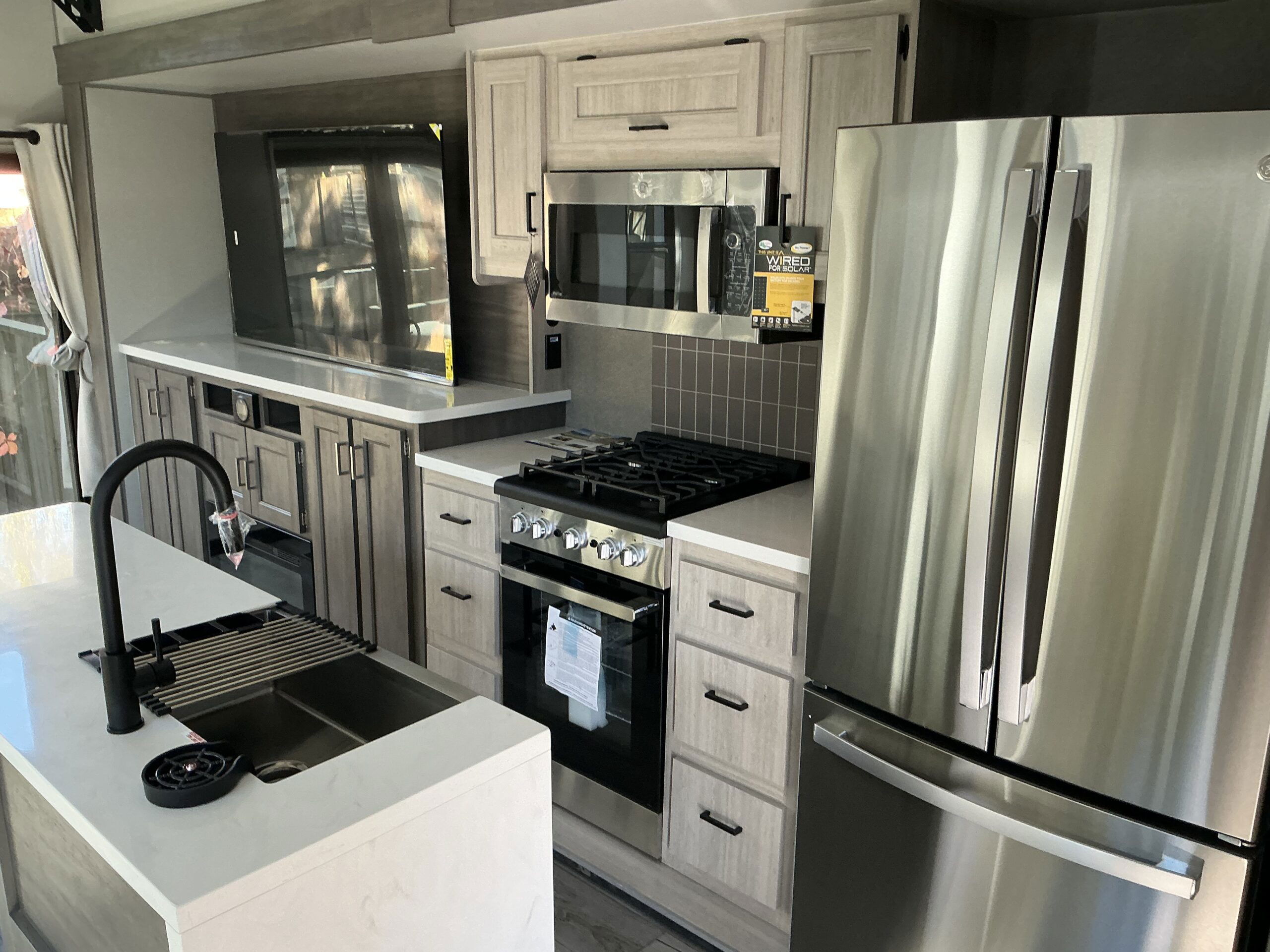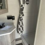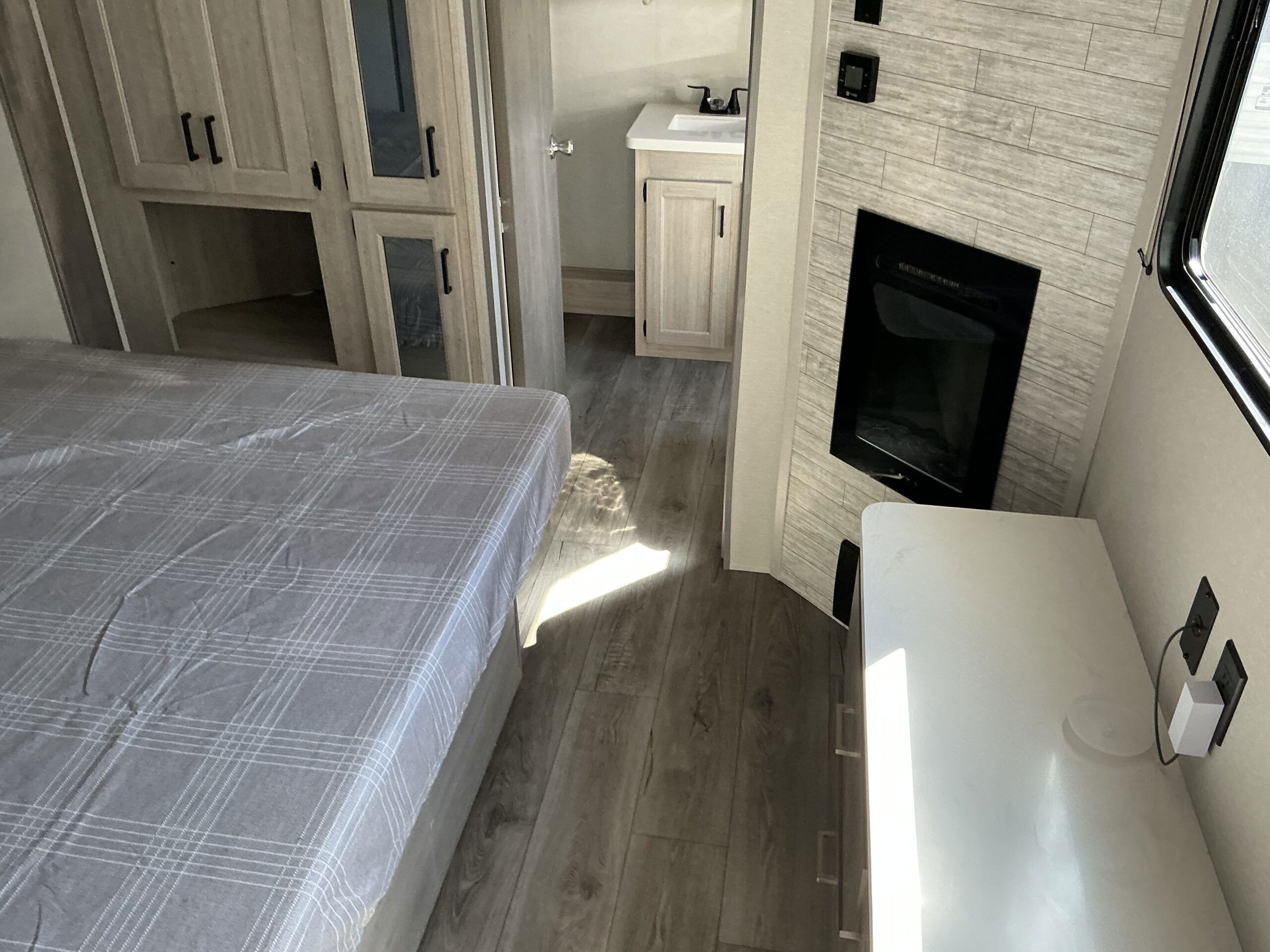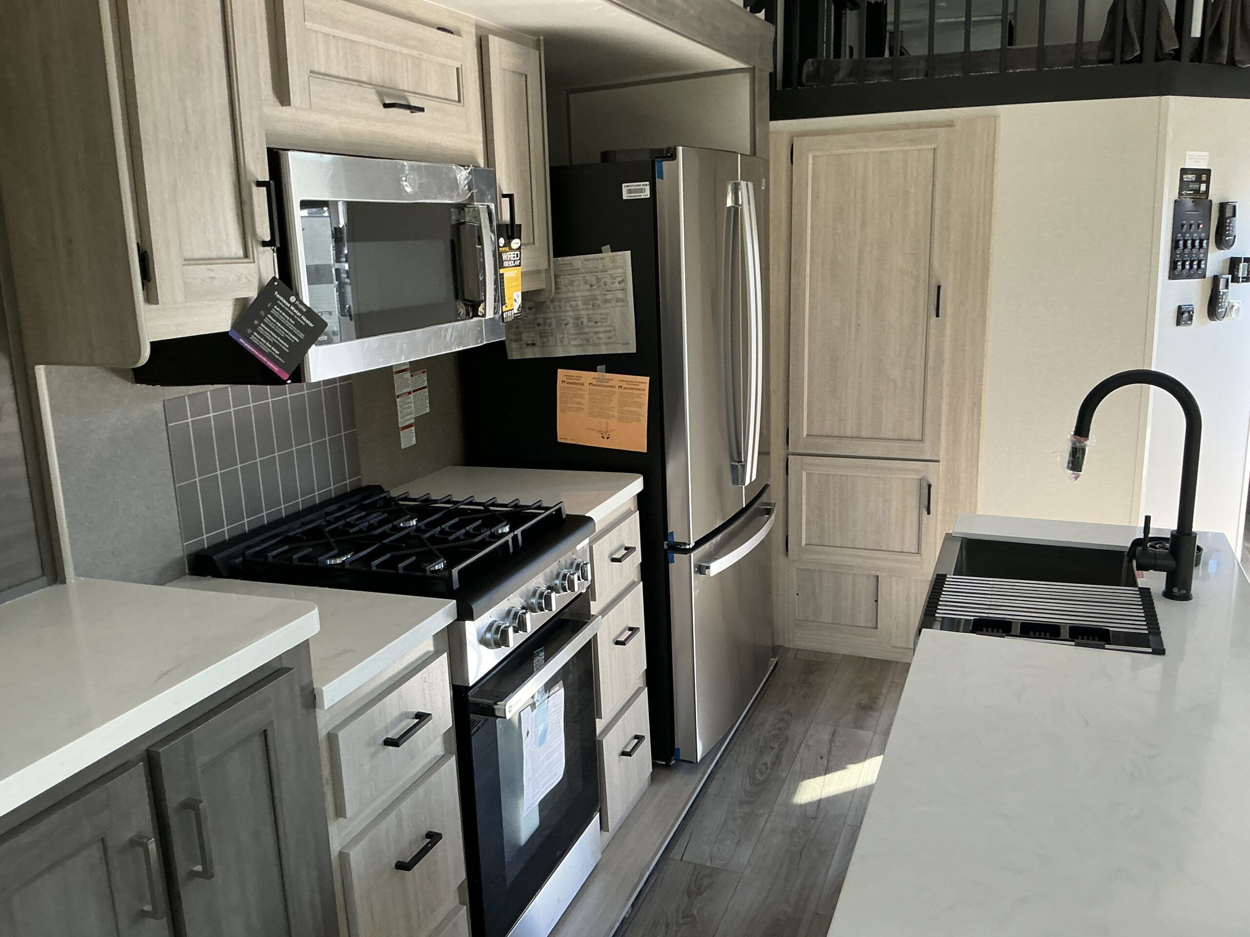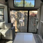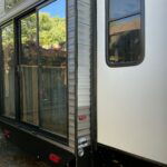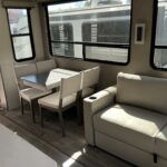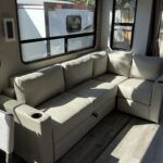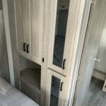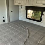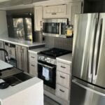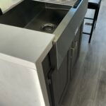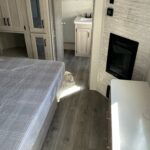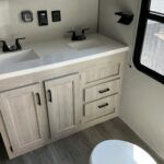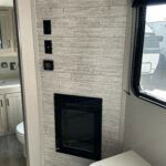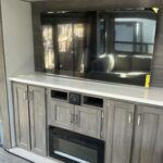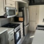 There is much to love about this destination trailer! Starting with the loft that has two queen beds, a wardrobe/storage, and a custom 58″ x 71″ bed. Downstairs there’s a private bedroom with a king bed slide, a fireplace, and its very own private full bathroom complete with a dual sink vanity. The main living area has a huge bi-fold sleeper sectional sofa so you can fit even more guests, or just relax and watch the TV on the power lift in the entertainment center. The kitchen is well-equipped with a residential refrigerator, microwave, and pantry. The centerpiece here is a kitchen island with a deep basin farm-style sink and bar stool seating so your group can gather together and make new memories. The second full bath has a roomy 36″ x 30″ shower with glass door, and just outside it is the stackable washer and dryer!