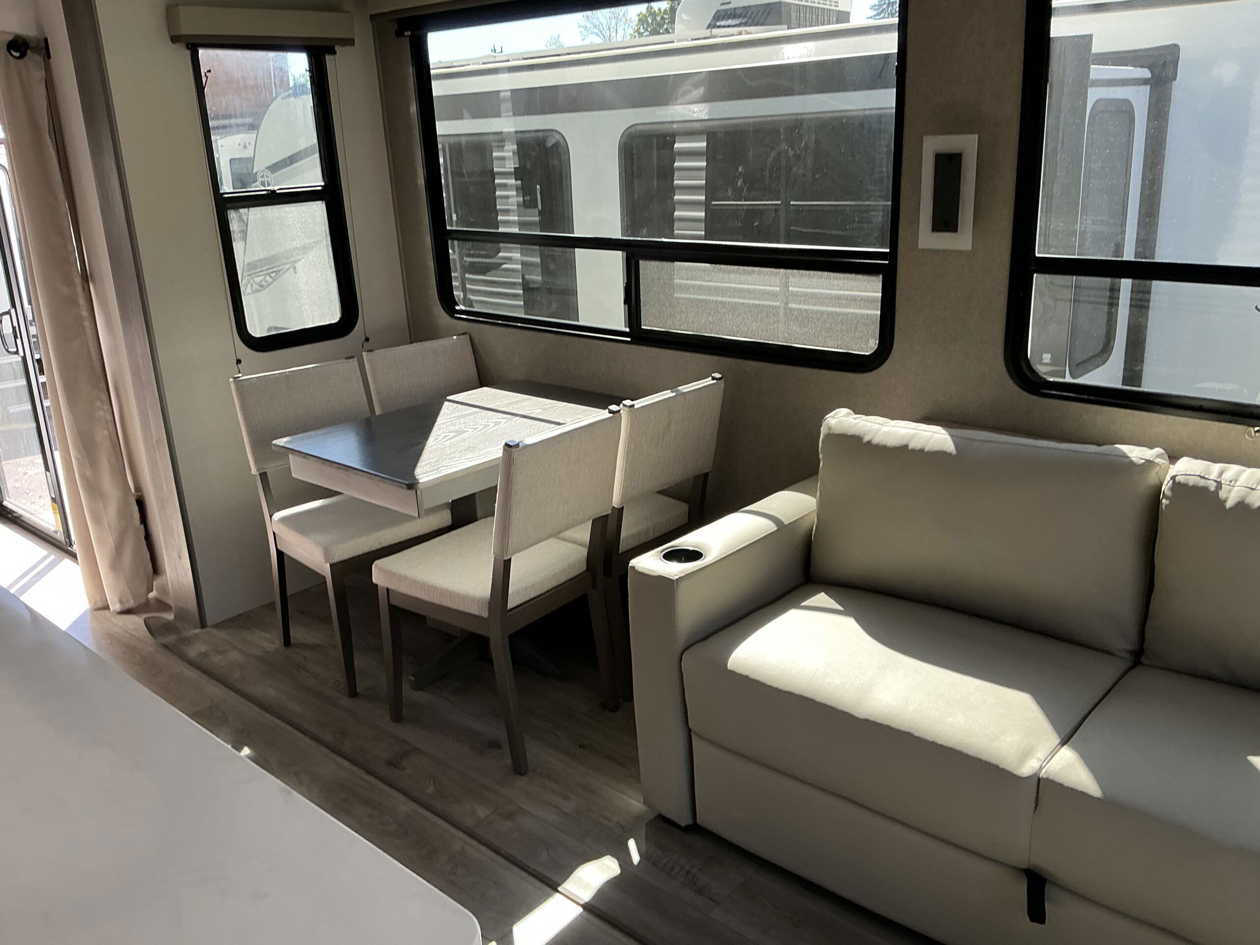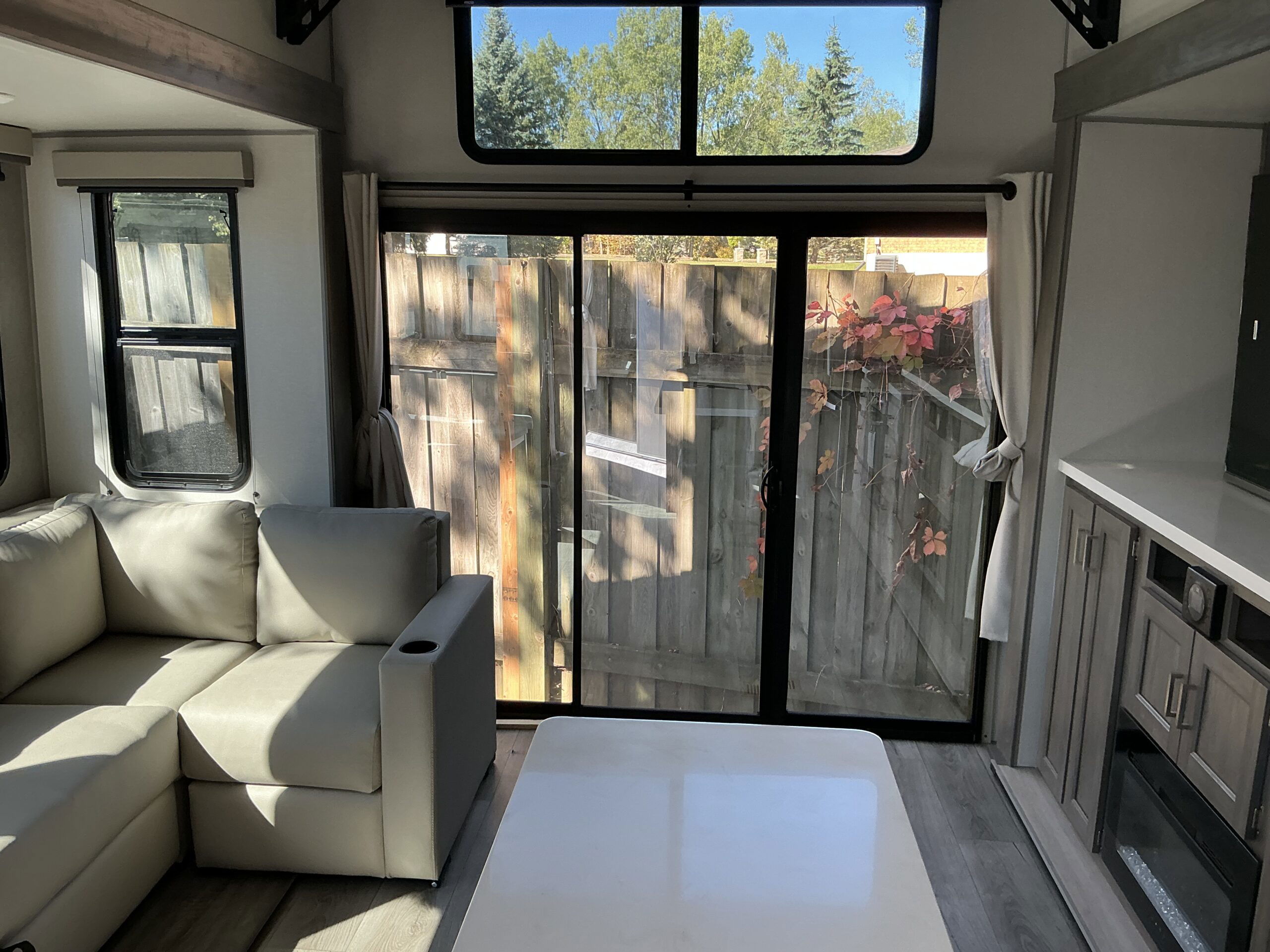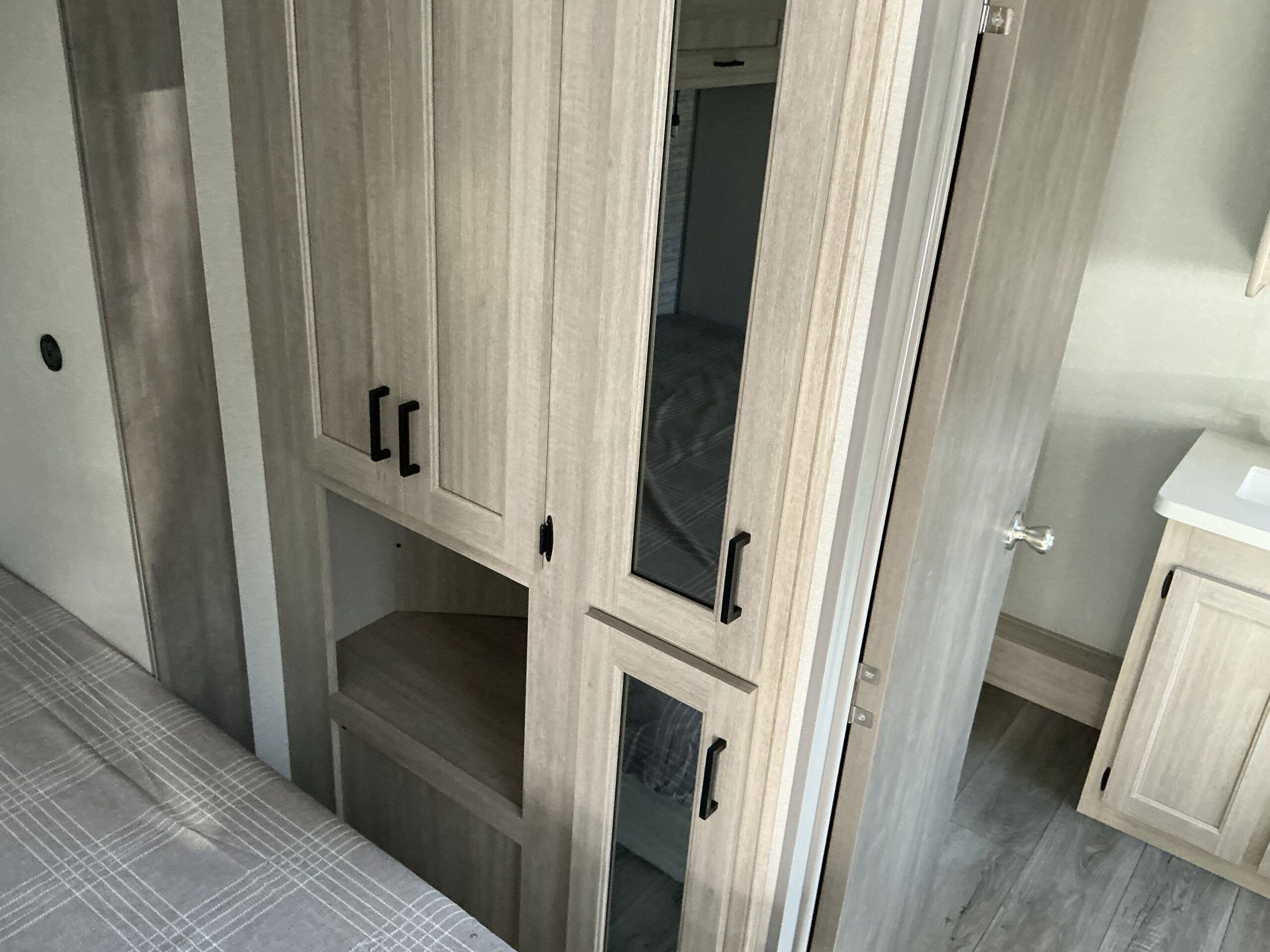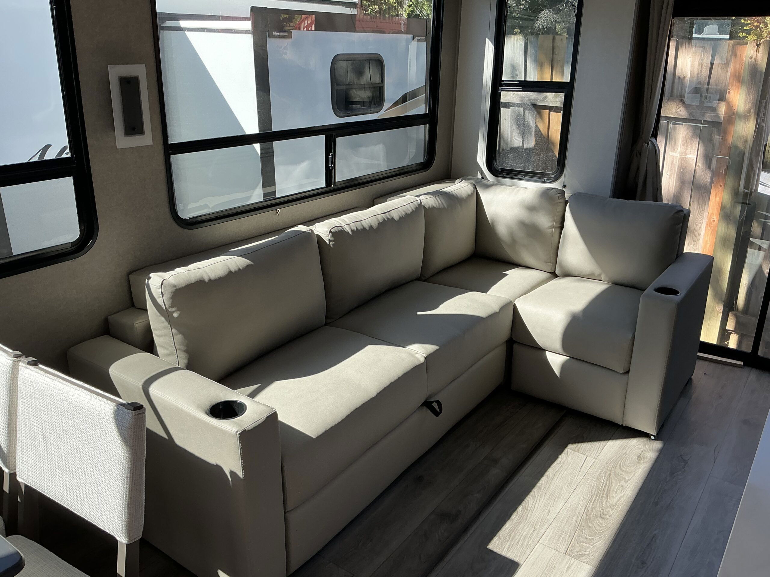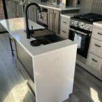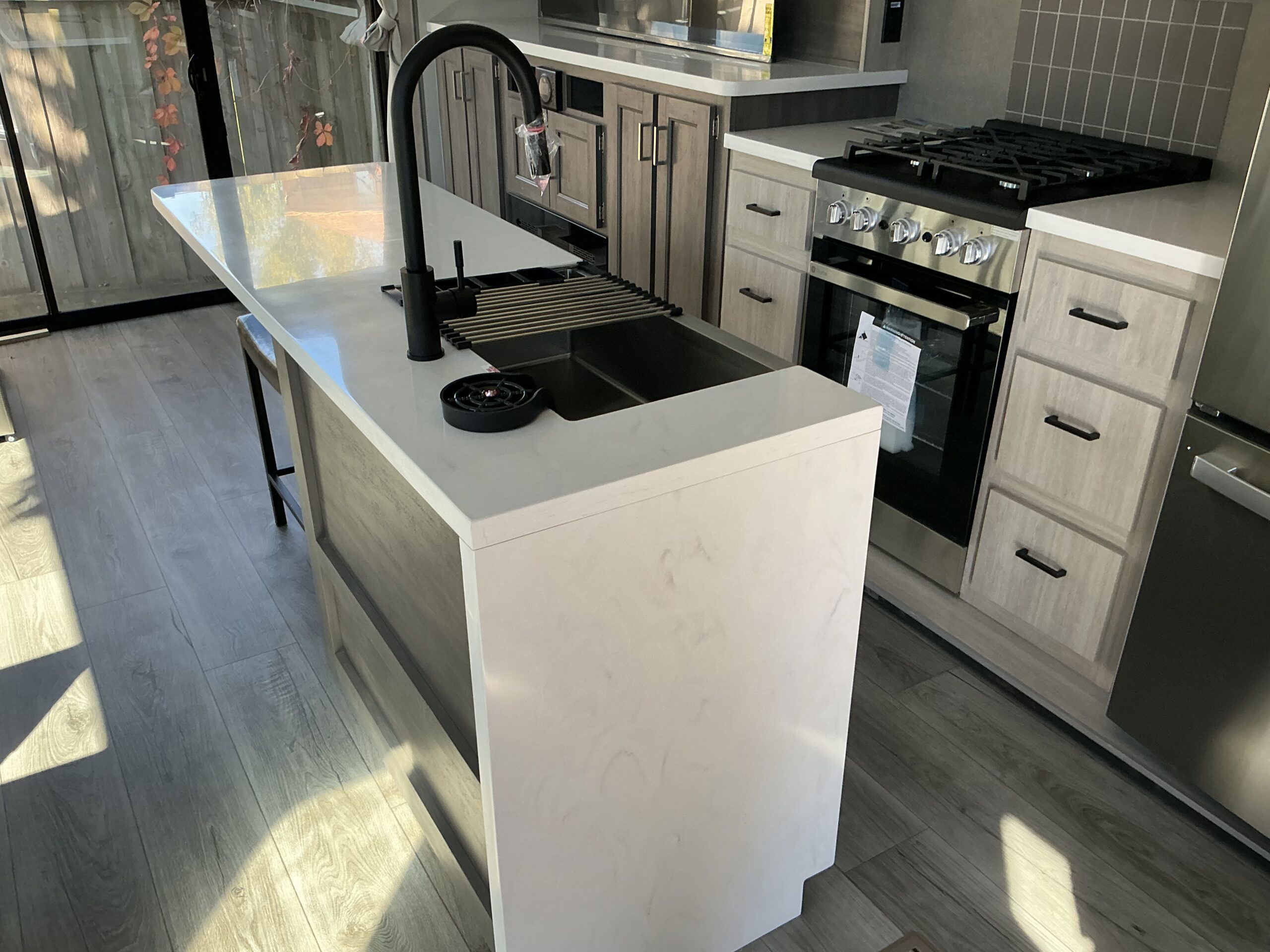 There is much to love about this destination trailer! Starting with the loft that has two queen beds, a wardrobe/storage, and a custom 58″ x 71″ bed. Downstairs there’s a private bedroom with a king bed slide, a fireplace, and its very own private full bathroom complete with a dual sink vanity. The main living area has a huge bi-fold sleeper sectional sofa so you can fit even more guests, or just relax and watch the TV on the power lift in the entertainment center. The kitchen is well-equipped with a residential refrigerator, microwave, and pantry. The centerpiece here is a kitchen island with a deep basin farm-style sink and bar stool seating so your group can gather together and make new memories. The second full bath has a roomy 36″ x 30″ shower with glass door, and just outside it is the stackable washer and dryer!