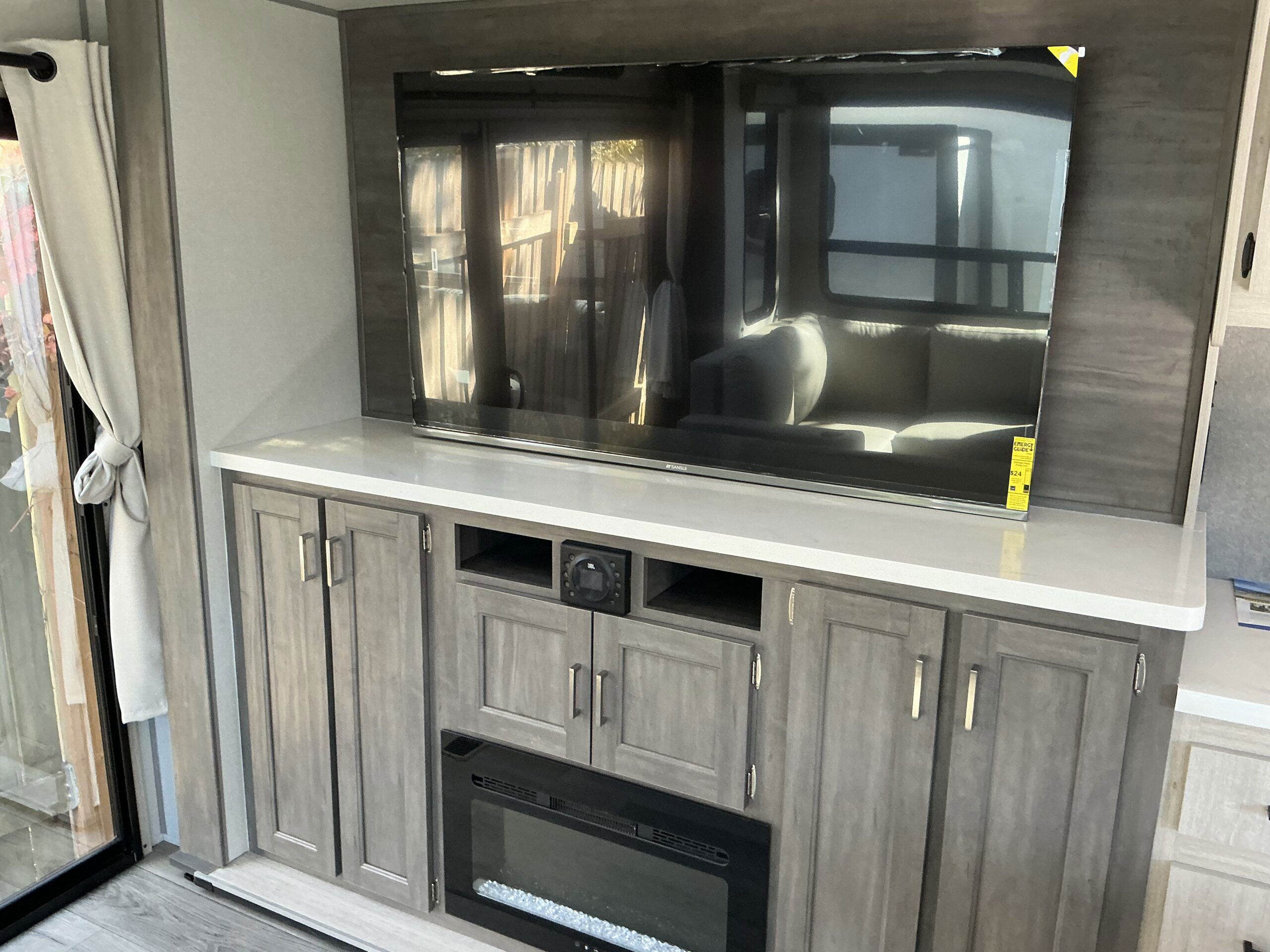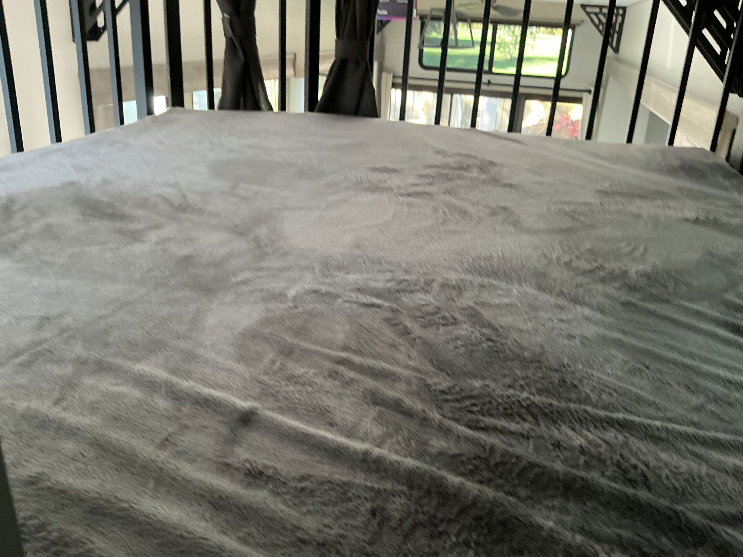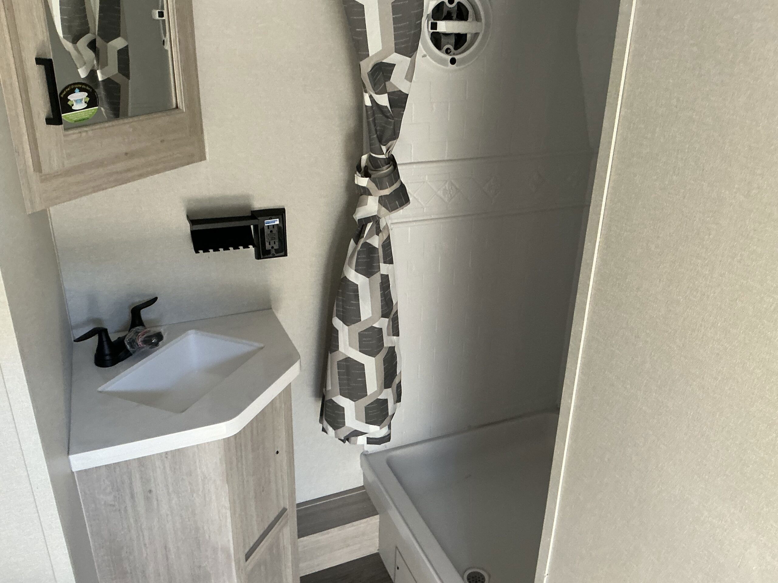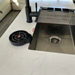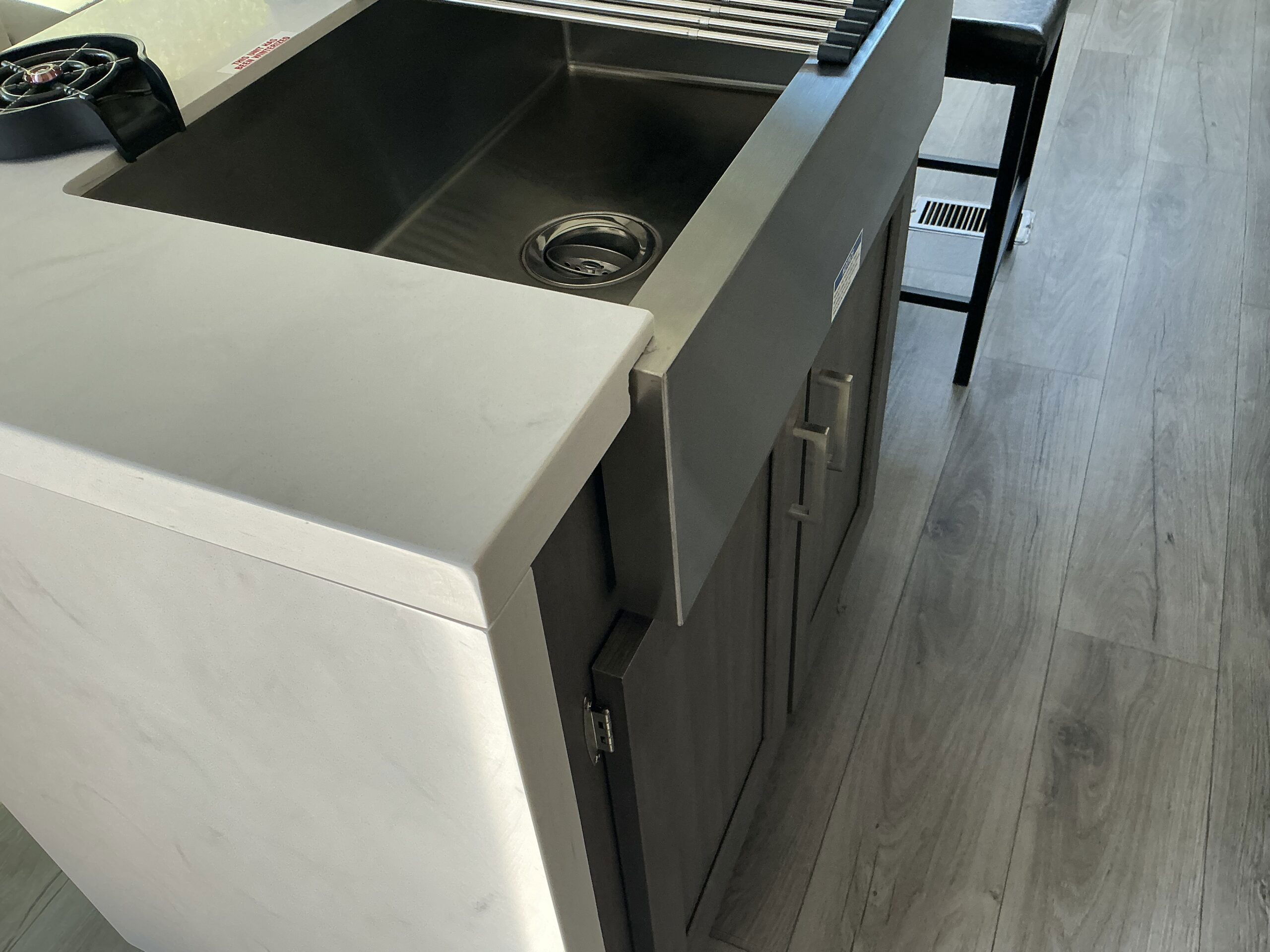 There is much to love about this destination trailer! Starting with the loft that has two queen beds, a wardrobe/storage, and a custom 58″ x 71″ bed. Downstairs there’s a private bedroom with a king bed slide, a fireplace, and its very own private full bathroom complete with a dual sink vanity. The main living area has a huge bi-fold sleeper sectional sofa so you can fit even more guests, or just relax and watch the TV on the power lift in the entertainment center. The kitchen is well-equipped with a residential refrigerator, microwave, and pantry. The centerpiece here is a kitchen island with a deep basin farm-style sink and bar stool seating so your group can gather together and make new memories. The second full bath has a roomy 36″ x 30″ shower with glass door, and just outside it is the stackable washer and dryer!